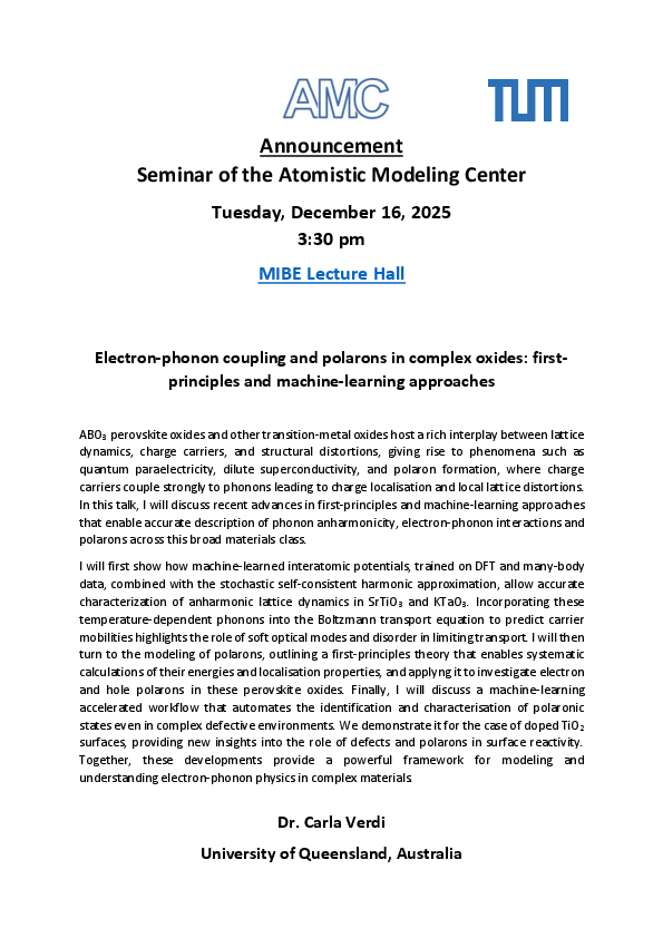 In her talk on “Electron-phonon coupling and polarons in complex oxides: first-principles and machine-learning approaches”, Verdi will explore how first-principles and machine-learning methods advance the understanding of electron‑phonon interactions and polaron formation in complex oxides, enabling accurate modeling of anharmonic lattice dynamics, carrier mobilities, and localized charge states. By combining machine‑learned interatomic potentials, transport theory, and automated workflows, these approaches provide new insights into phenomena such as soft‑mode limited transport and defect‑driven polaronic behavior in materials like SrTiO3, KTaO3, and doped TiO2.
