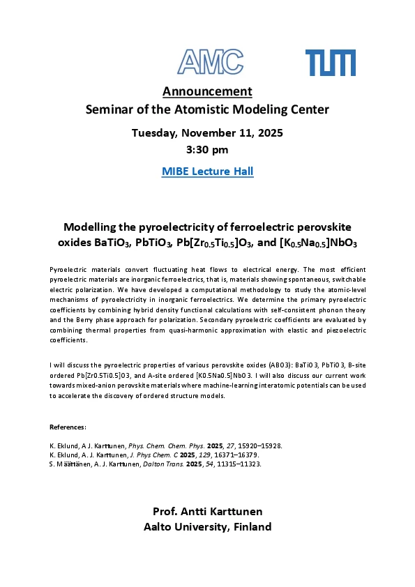 Karttunen’s talk on “Modelling the pyroelectricity of ferroelectric perovskite oxides BaTiO3, PbTiO3, Pb[Zr0.5Ti0.5]O3, and [K0.5Na0.5]NbO3” will present a computational approach to investigate the atomic-level mechanisms of pyroelectricity in inorganic ferroelectrics, focusing on calculating primary and secondary pyroelectric coefficients using advanced theoretical methods. He will explore the pyroelectric behavior of various perovskite oxides and highlight ongoing efforts to discover mixed-anion perovskites through machine-learning-driven modeling.